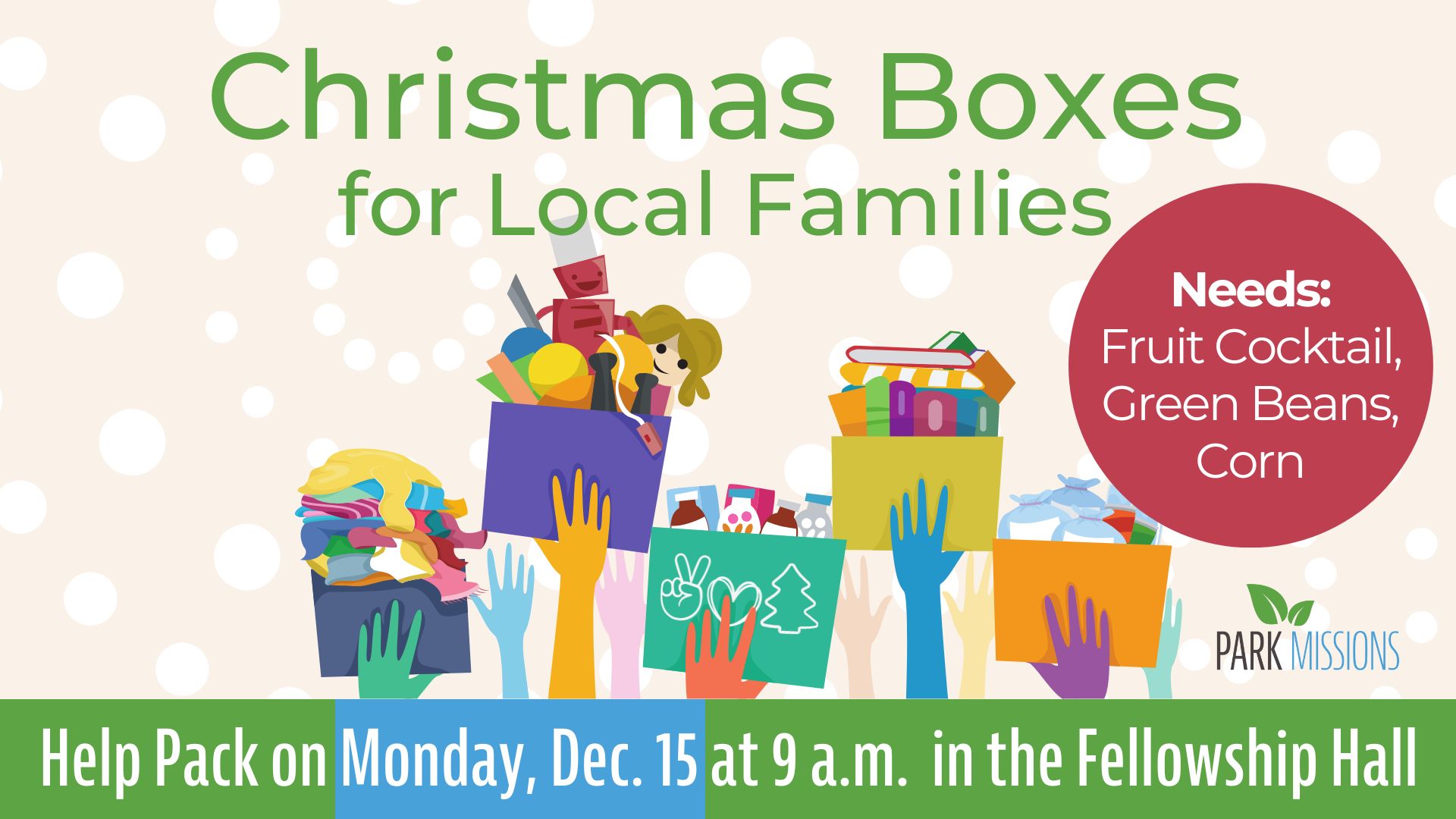 The Backpack Buddies ministry sends home boxes of food to the families of our kids to use over the holiday break. We are in need of helpers to pack the boxes on Monday, Dec. 15 at 9 a.m. We also need donations of green beans, corn, and fruit cocktail.